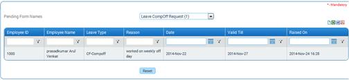 Key-in ‘Forms Pending for Your Approval’ in ZOLOG search bar. Select ‘Leave CompOff Request’ from this list. On selecting the form name, the list of requests that are awaiting approval will be shown as below: