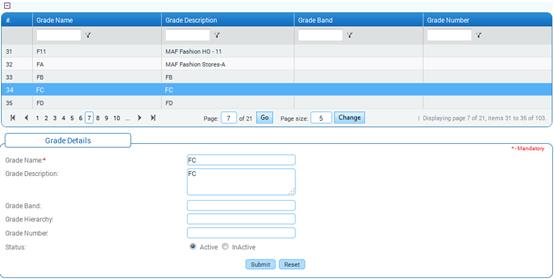 To Modify any Grade, select the Grade from the grid. Selected Grade will be populated in the form. Make necessary changes and click [Submit] to save the changes.